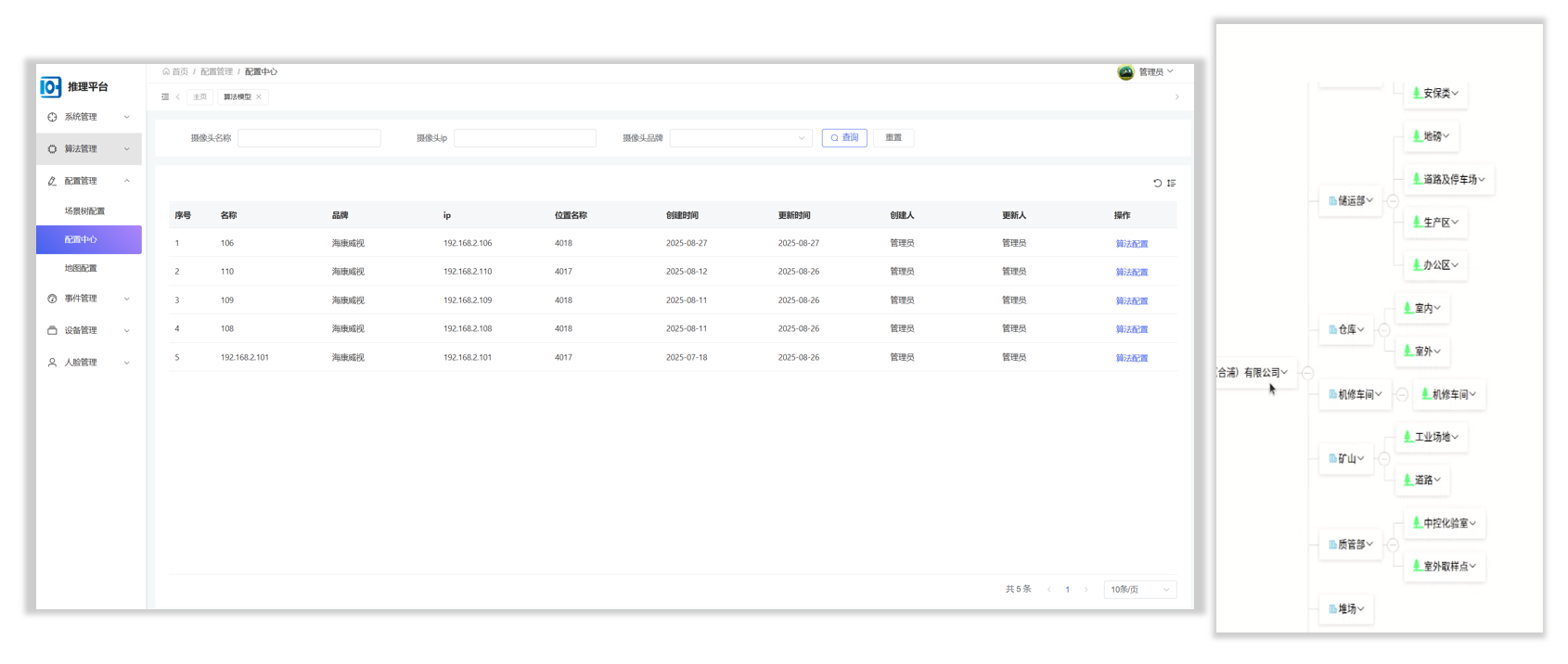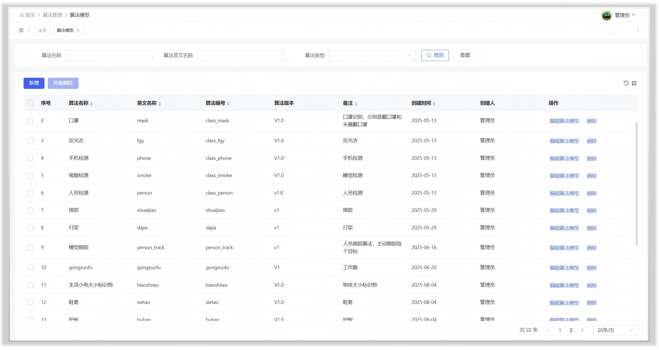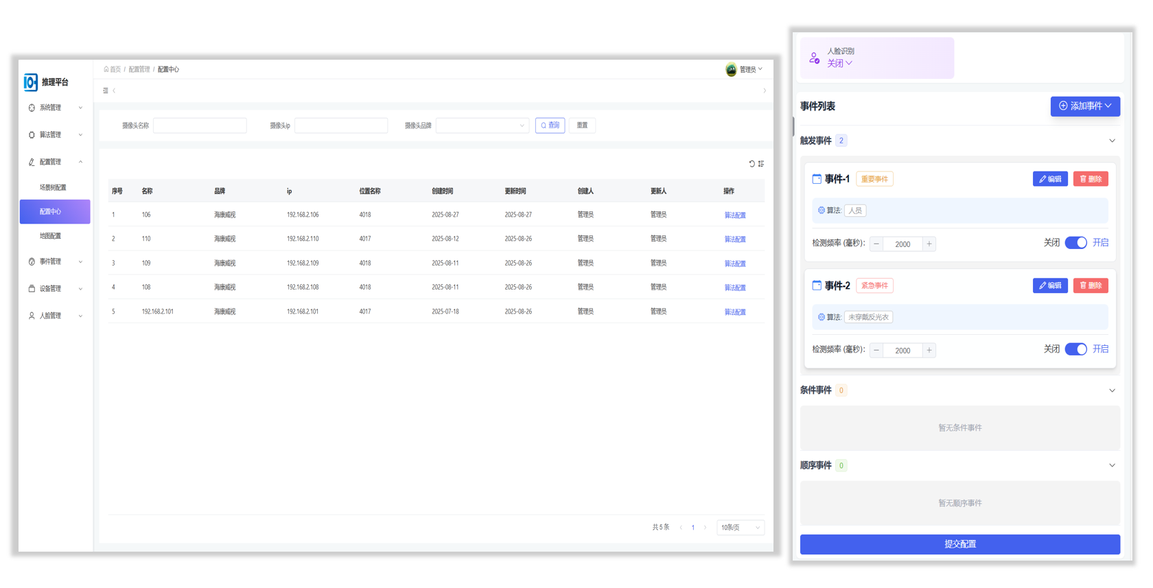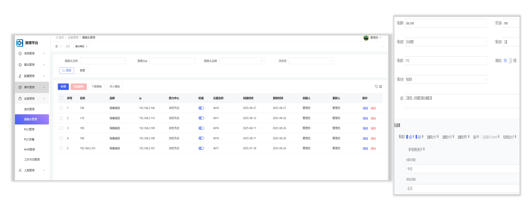 支持不同品牌、不同型号的摄像头统一管理。同一个摄像头下可以接入多个算法同一个算法下可以接入多个摄像头。